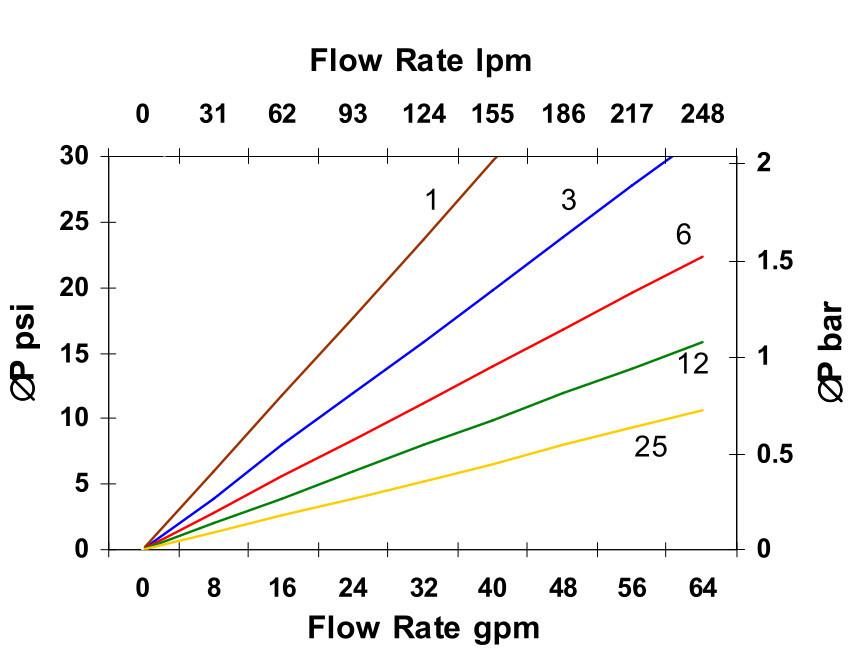 This filter is compatible with the following fluids but pressure drop will vary depending on viscosity and temperature: