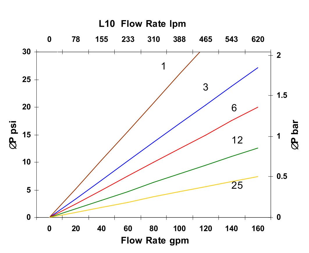 This filter is compatible with the following fluids but pressure drop will vary depending on viscosity and temperature: