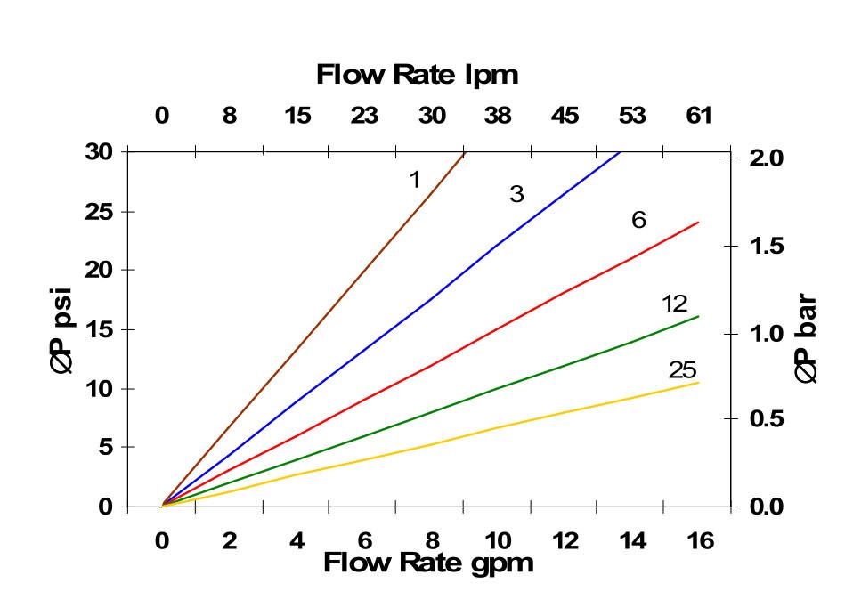 This filter is compatible with the following fluids but pressure drop will vary depending on viscosity and temperature: